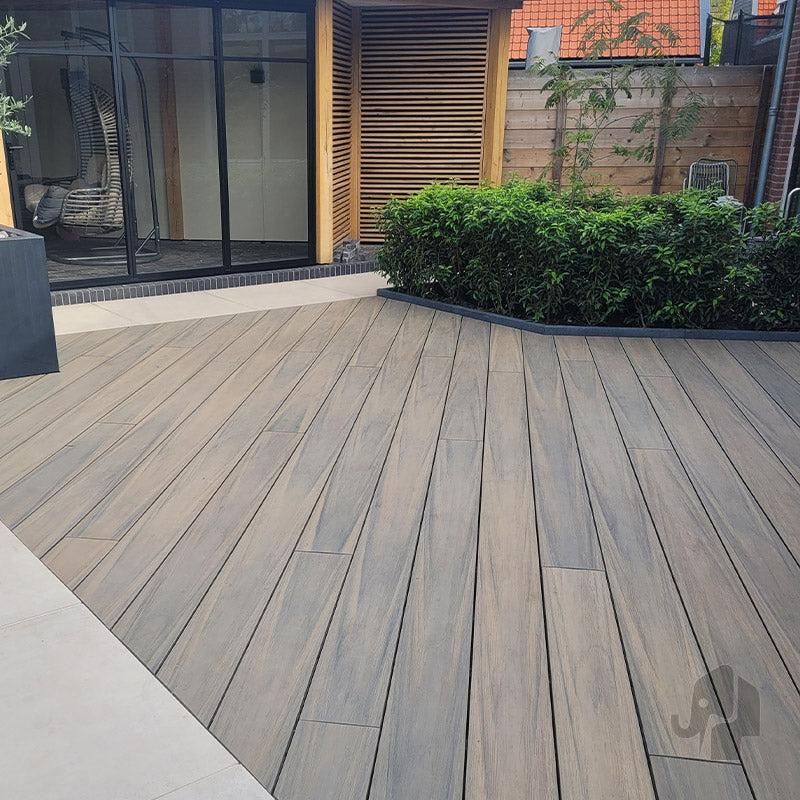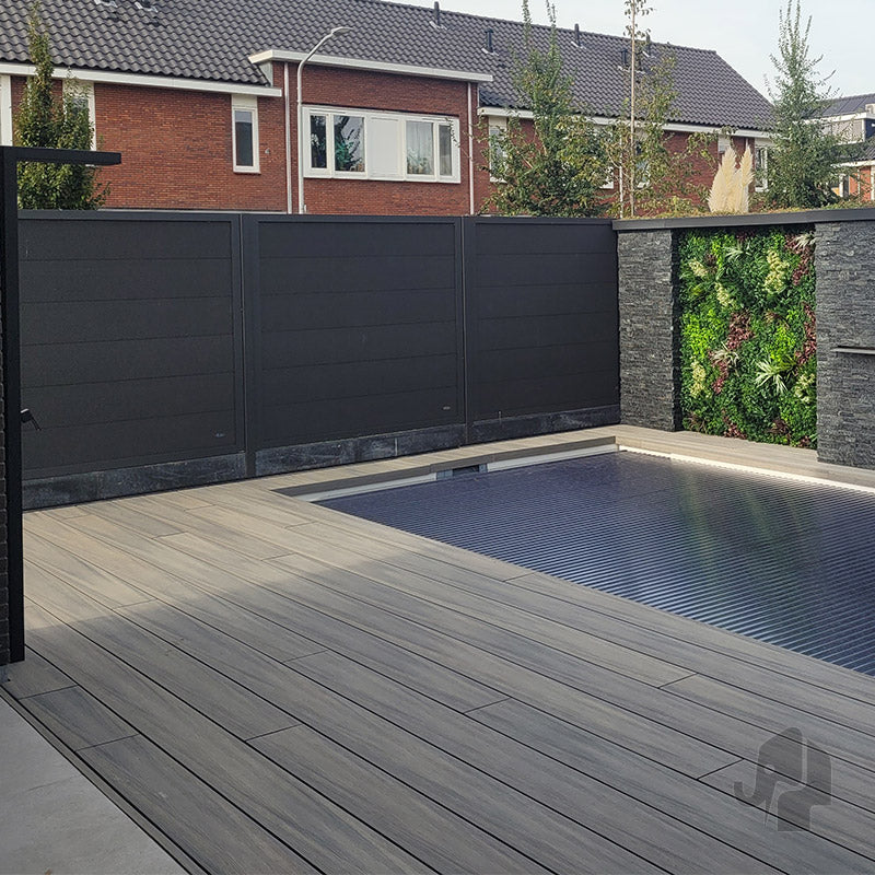Houtcomposiet bestaat uit houtvezels en kunststof. Het houtdeel heeft een FSC-certificaat (Forest Stewardship Council) en komt uit verantwoord beheerde bossen. Je kiest hiermee voor een duurzaam product met de warme uitstraling van hout en het praktische onderhoudsgemak van composiet.